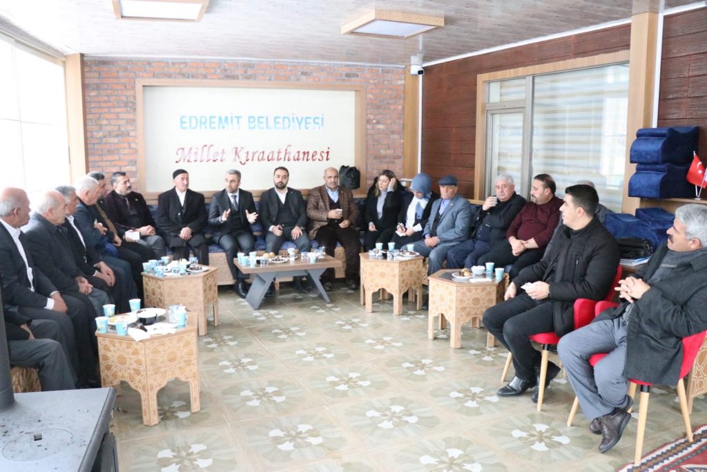 Edremit Belediyesi Millet Kıraathanesi’nde gerçekleştirilen toplantıya AK Parti Van Milletvekili Abdulahat Arvas, Edremit Belediye Başkanı İsmail Say, AK Parti Edremit İlçe Başkanı Sezer Bayramoğlu, belediye meclis üyeleri ve mahalle muhtarları katıldı. Başkan İsmail Say’ın selamlama konuşması ile başlayan toplantı akabinde Edremit Belediyesi’nin yapmış olduğu hizmetlerin yer aldığı slayt sunumun izlenmesi ile devam etti. Daha sonra muhtarlara söz veren Başkan Say, talepleri Milletvekili Arvas ile birlikte değerlendirdi. Mahalle muhtarlarının mahallelerine ilişkin yapılmasını istedikleri hizmetlere dair talep ve önerilerini dile getirdikleri toplantıda ayrıca mahallelerde yapılacak yeni çalışmalar hakkında ise karşılıklı istişarelerde bulunuldu. Milletvekili Arvas’ın yoğun programı nedeniyle oradan ayrılması ile toplantı Başkan Say ve muhtarlarla devam etti.
