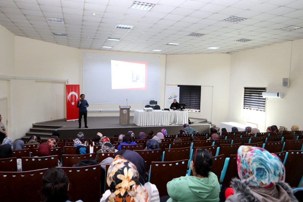 Kadın ve Aile Hizmetleri Daire Başkanlığı Konferans Salonu’nda düzenlenen seminerde Sosyolog Mustafa Polat ve Mesut Turğut tarafından katılımcı kadınlara aile yakınlığı, etkin dinlemenin önemi, aile bireylerine yuva sıcaklığını hissettirmek ve çocuklarda özgüven gibi konularda çeşitli bilgiler verildi.